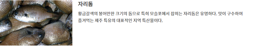 ✅자리돔 : 황금갈색의 붕어만 한 크기의 돔으로 특히 모슬포에서 잡히는 자리돔은 유명하며, 제주 특유의 대표적인 지역 특산물이다.