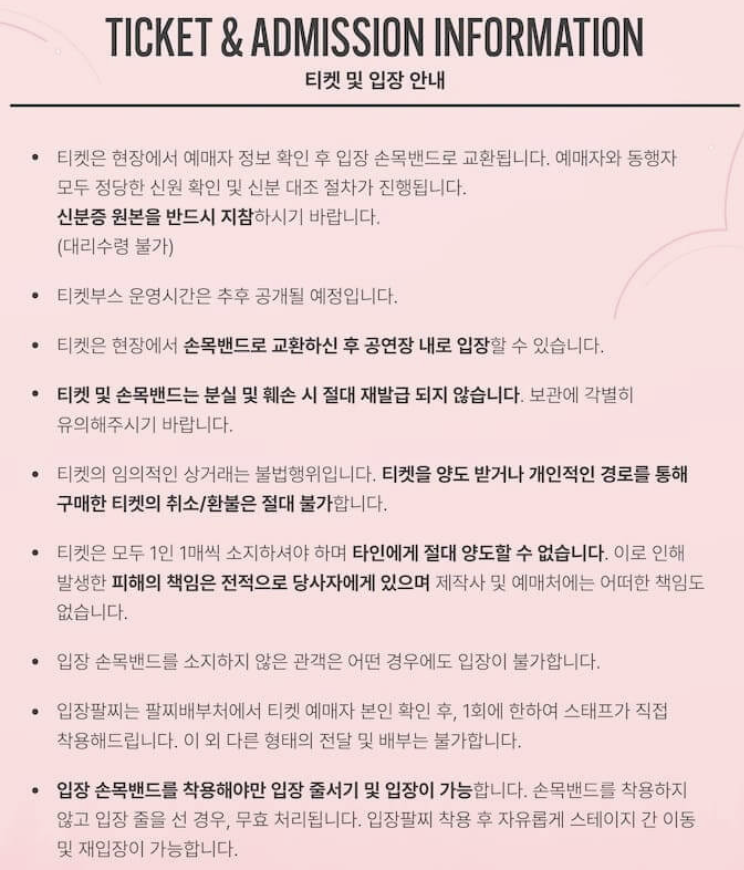 예매하신 티켓은 현장에서 예매 정보 확인 후 손목밴드(팔찌)로 교환됩니다. 신분증 필히 지참!